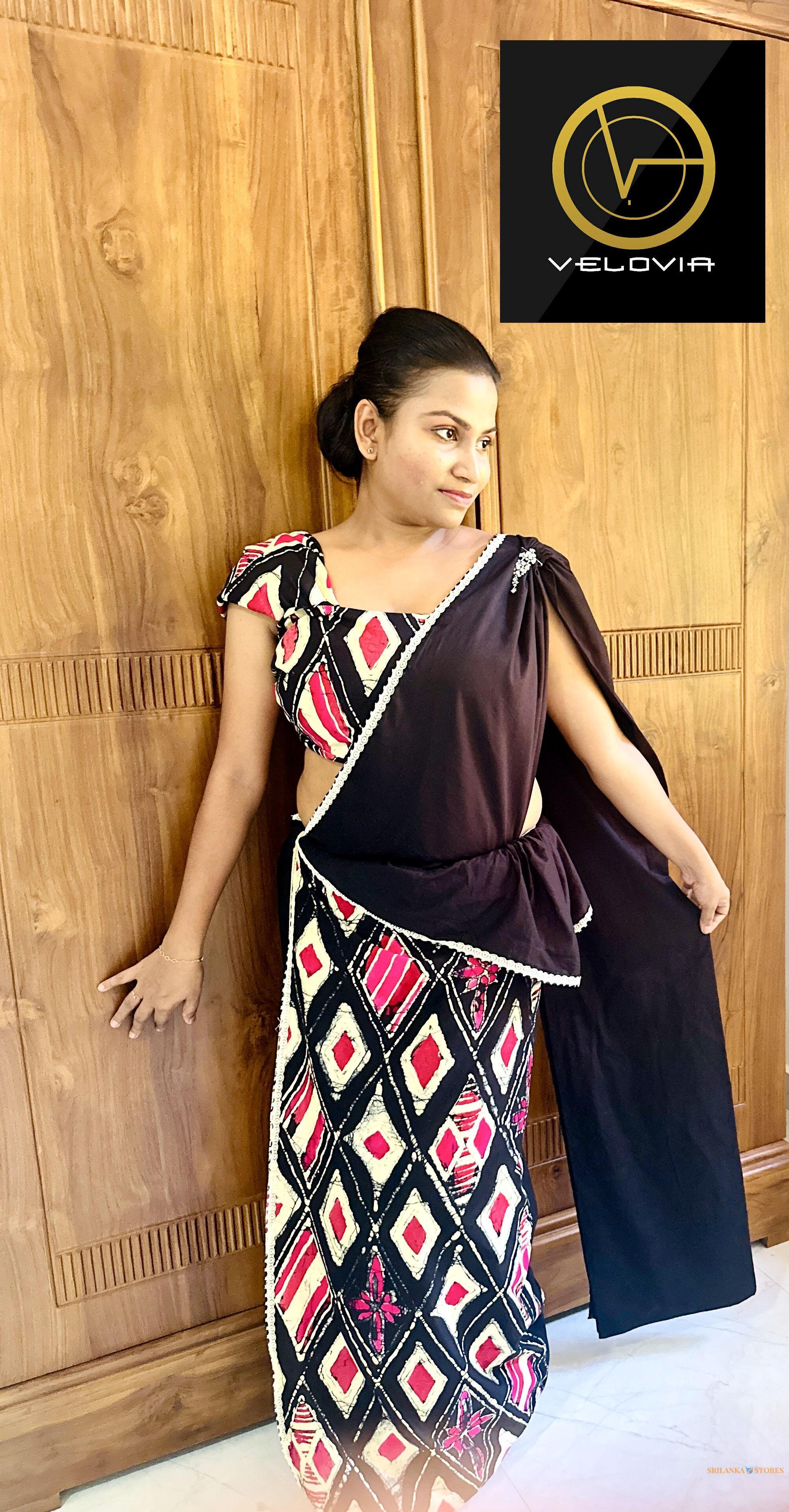 Step into elegance with this stunning three-colour batik saree in black, red, and yellow. Crafted from premium super voile fabric, it offers a graceful, comfortable fit and includes a matching jacket piece.