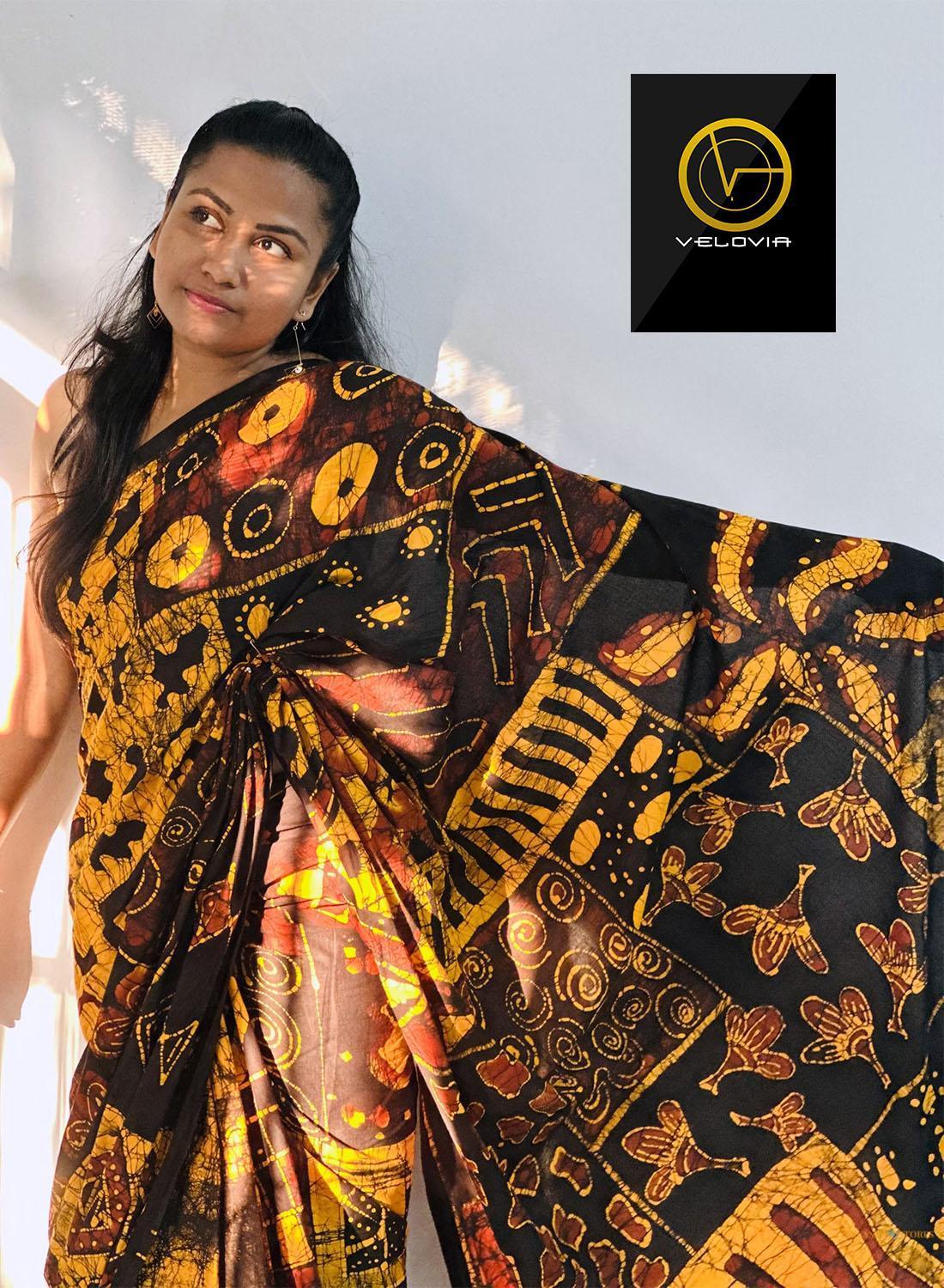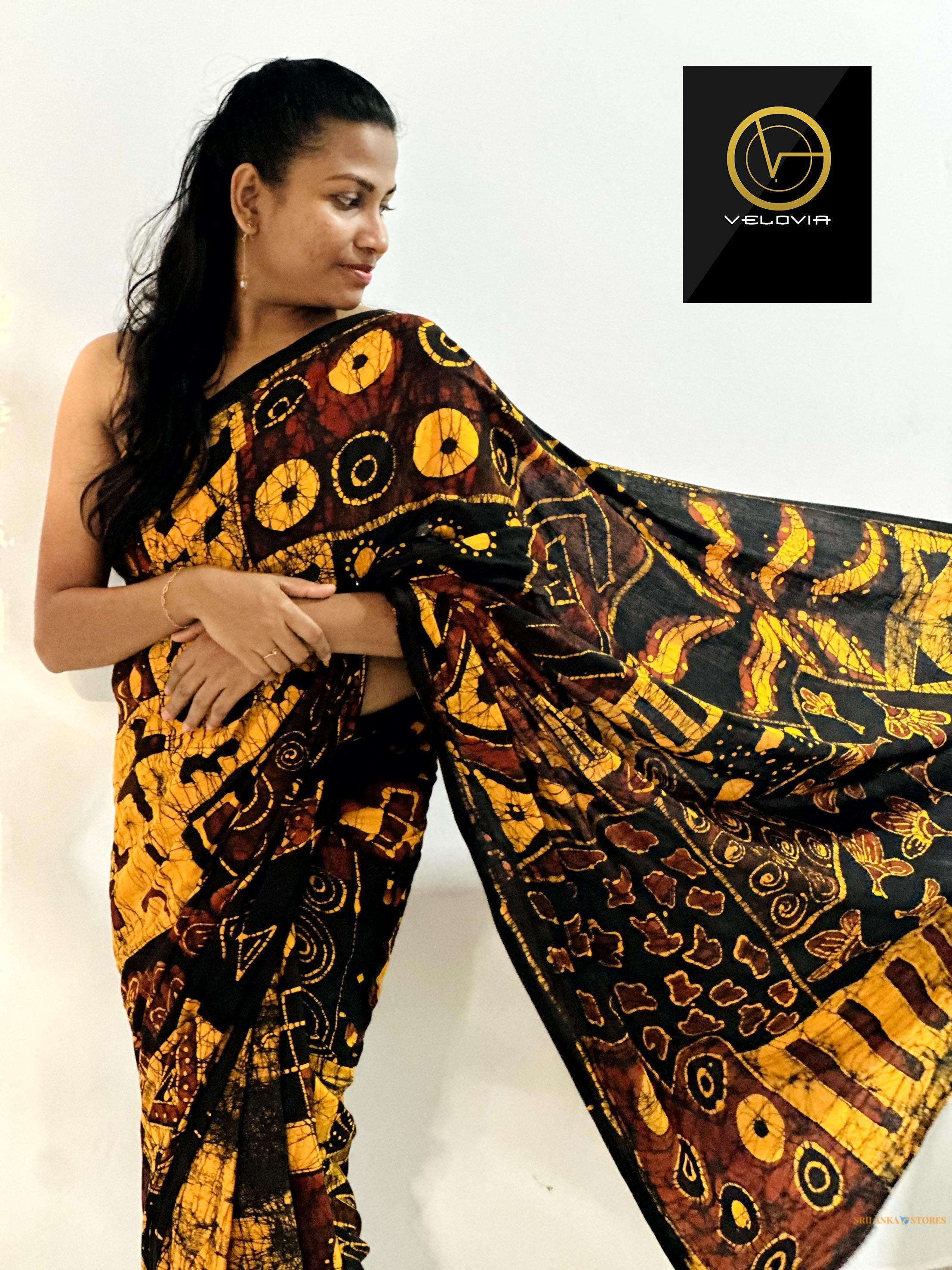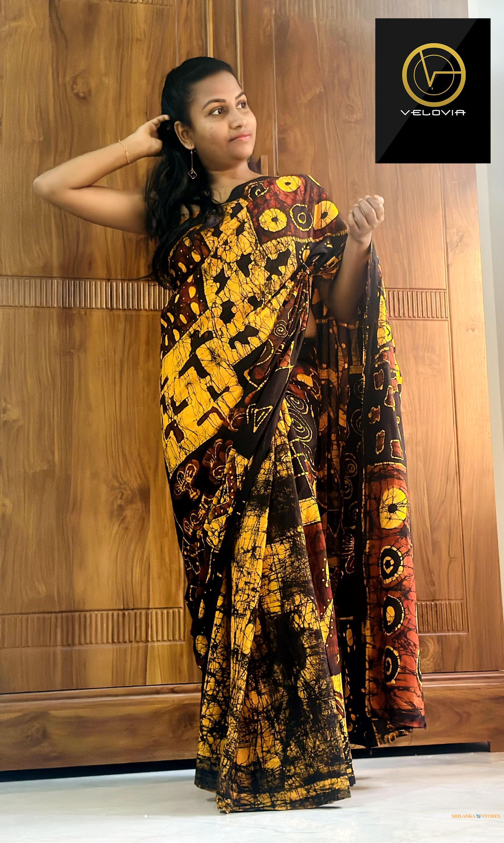 Elegant Handmade Batik Saree – Super Voile | Yellow, Brown & Black | 7 Yards with Jacket Piece