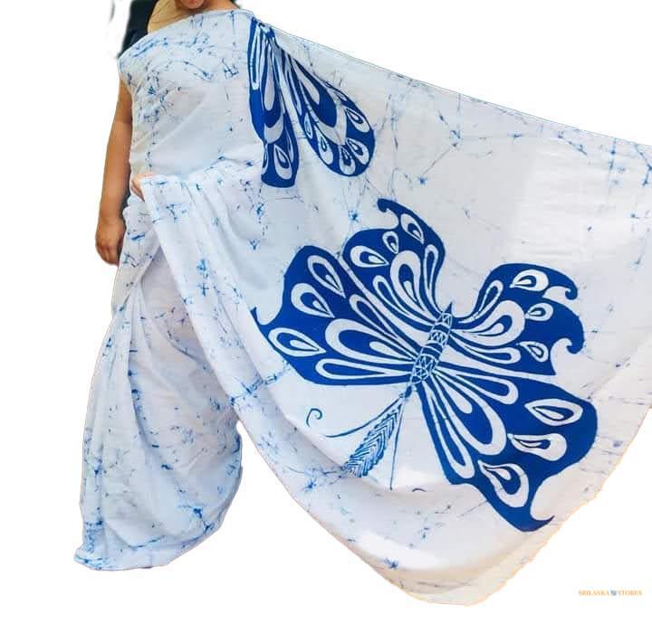 A stylish blue and white Batik saree handcrafted from Super Voil fabric. Includes a matching jacket piece. Perfect blend of tradition and elegance.