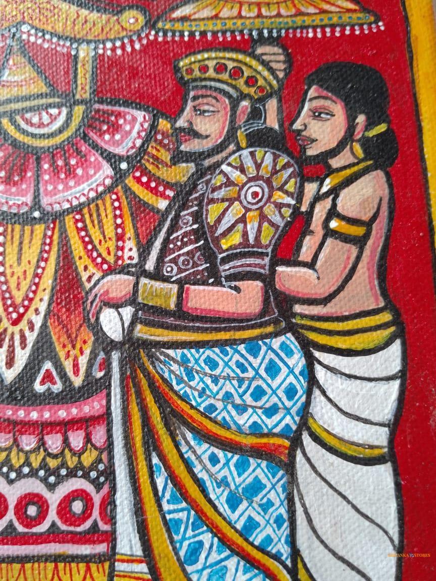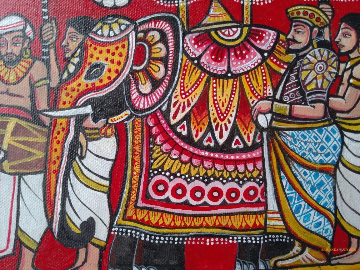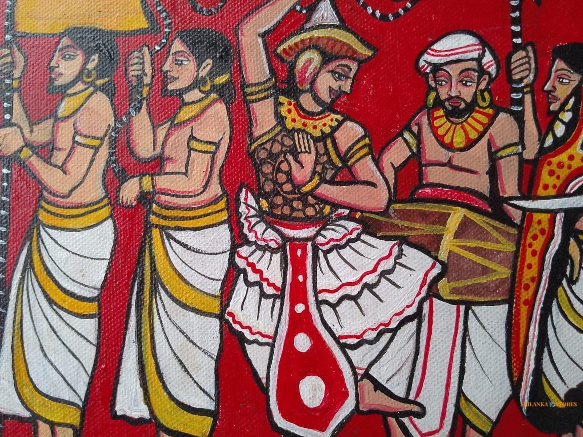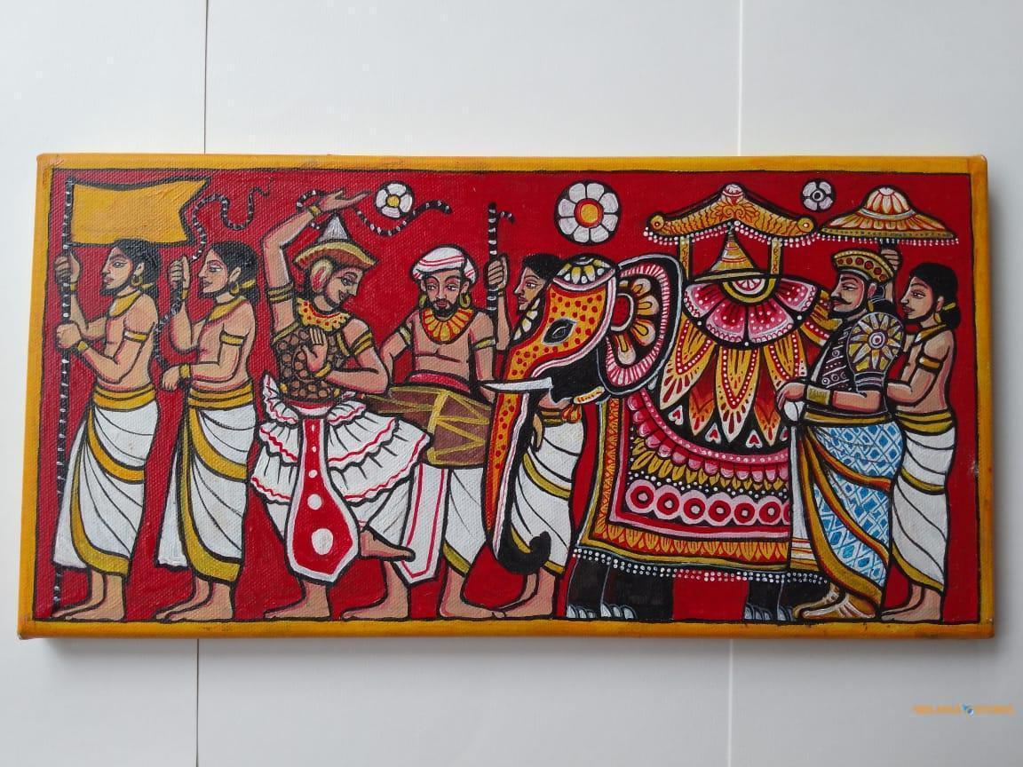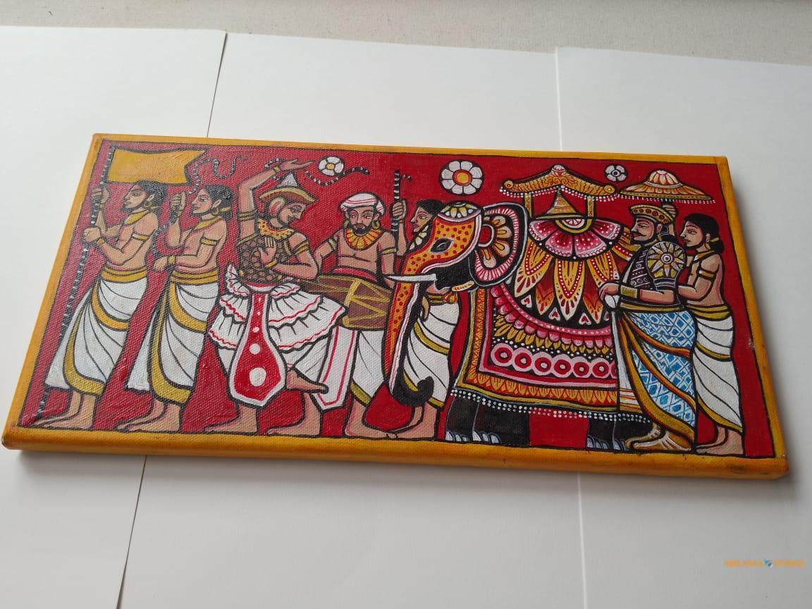 A striking acrylic painting on canvas capturing the vibrant spirit of the Kandy Esala Perahera. Handcrafted in the traditional Kandyan art style.