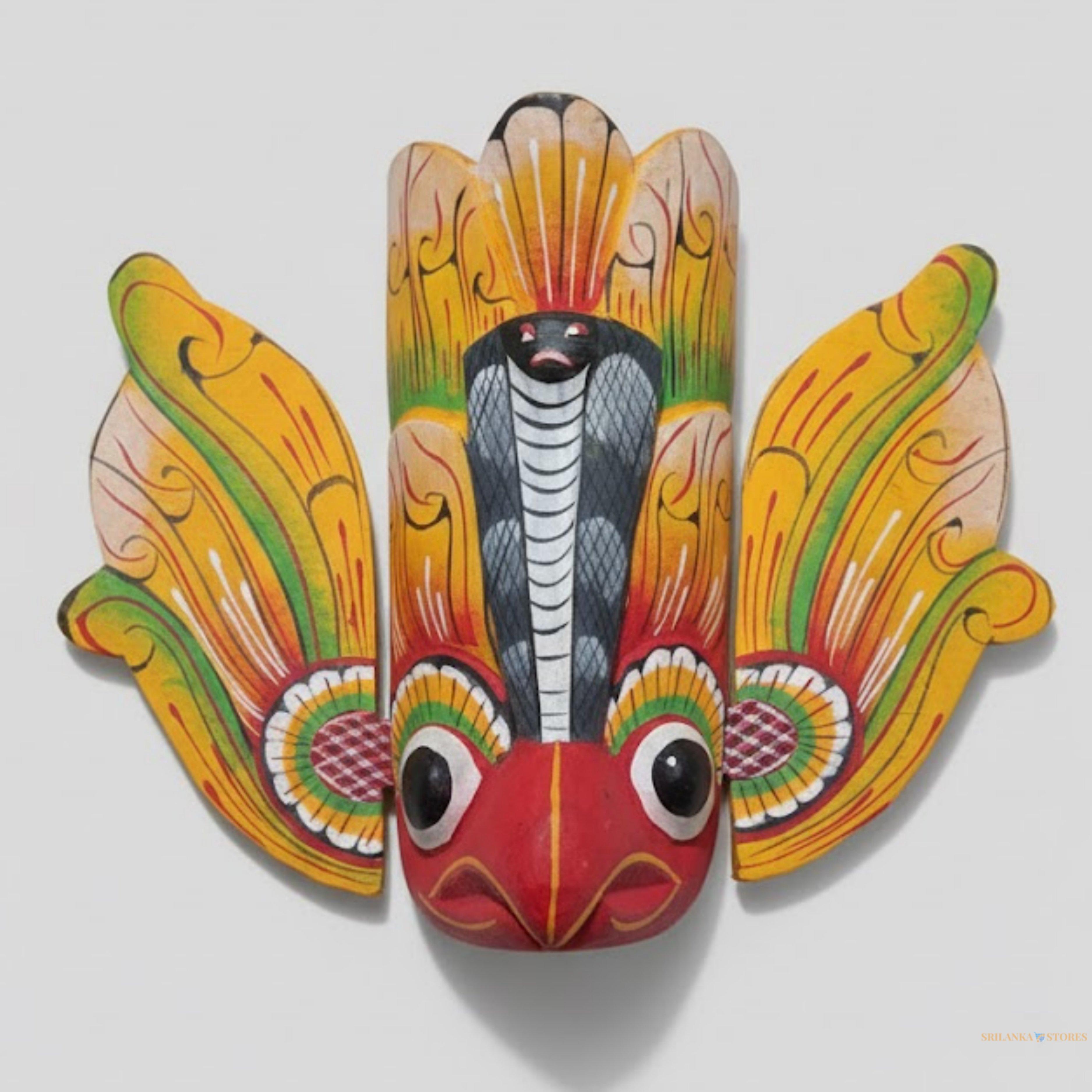 The Gurulu Raksha Traditional Mask is an iconic piece of Sri Lankan traditional mask art, inspired by Gurulu, the mythical bird known for power, protection, and bravery in local folklore. This mask is carefully handcrafted from quality wood and hand painted by skilled artisans, featuring vibrant colors, bold expressions, and intricate detailing.