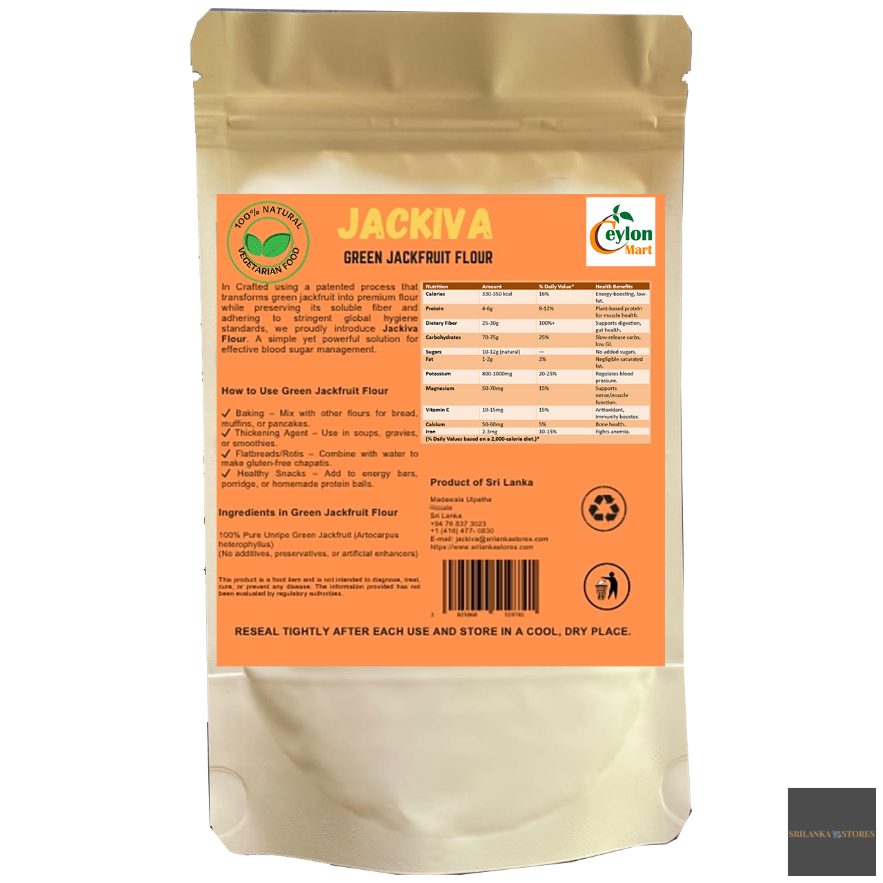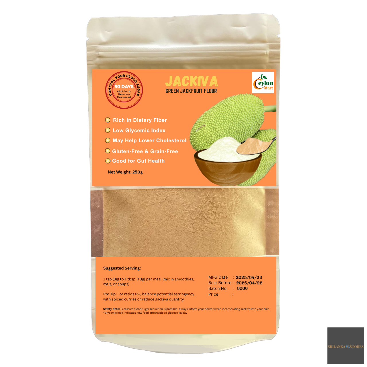 JACKIVA Green Jackfruit Flour by Ceylon Mart (Pvt) Ltd is a revolutionary food product made from 100% unripe green jackfruit (Artocarpus heterophyllus). Developed through a patented process that retains soluble fiber while meeting global hygiene standards, JACKIVA is your natural ally in managing blood sugar effectively.