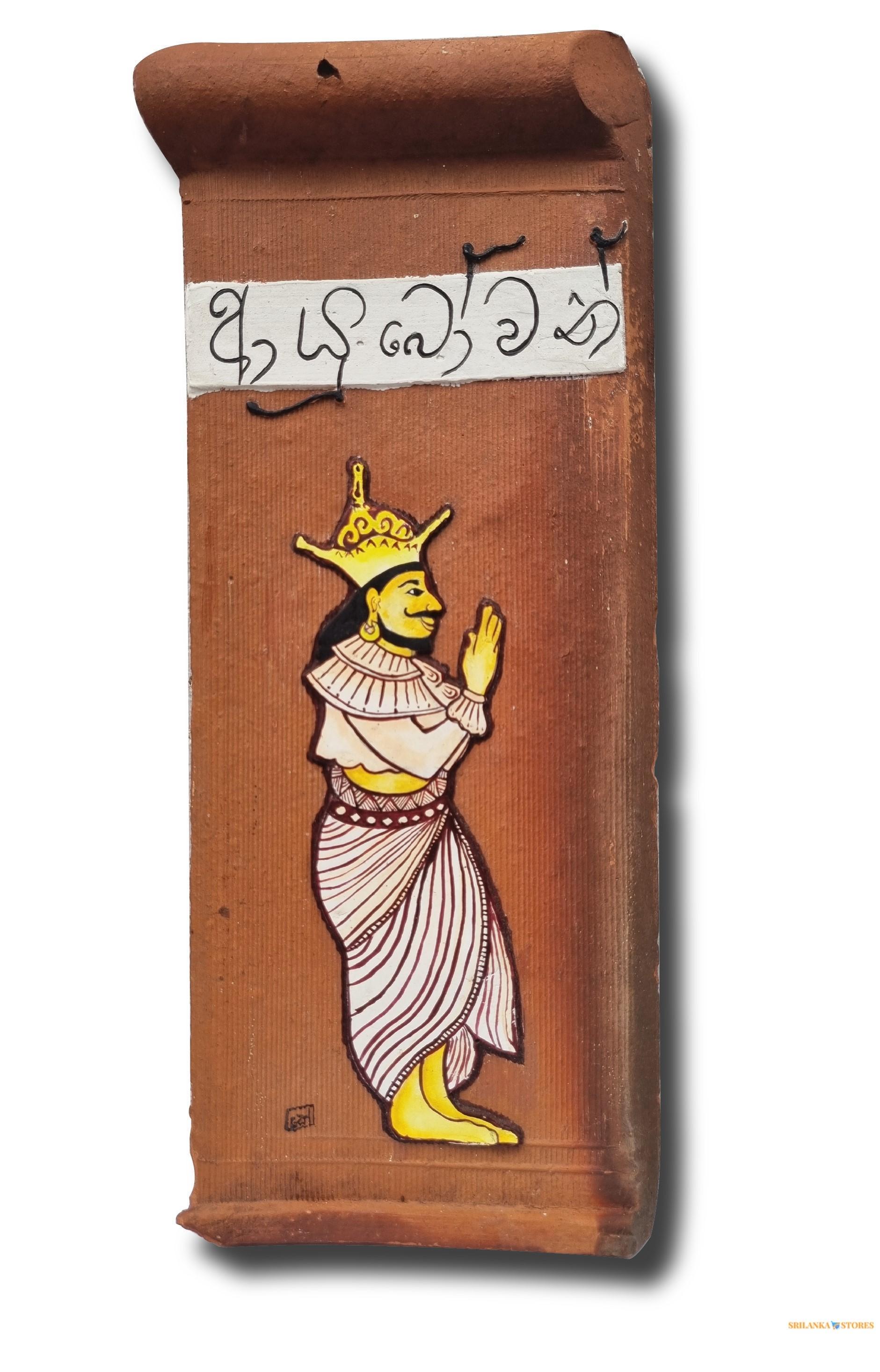 Painted on a 16 inch x 7 inch terracotta clay roofing tile, the artwork features a traditionally dressed Kandyan figure offering the graceful Ayubowan gesture — a powerful symbol of Sri Lankan hospitality, respect, and peace.