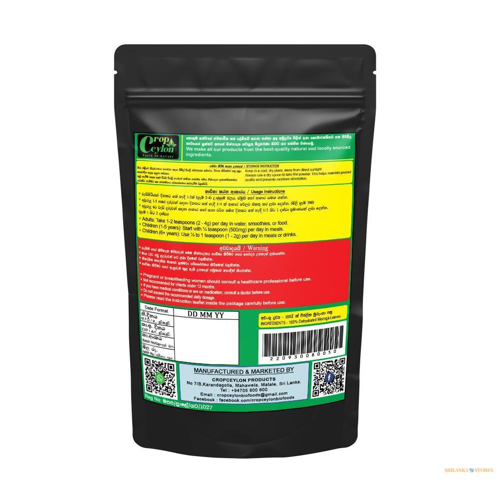 - Cropceylon Moringa Powder is made from handpicked Moringa oleifera leaves, dried and finely ground to preserve their rich nutritional content. It is a 100% natural, vegan, and gluten-free supplement, free from additives, preservatives, and artificial colors.