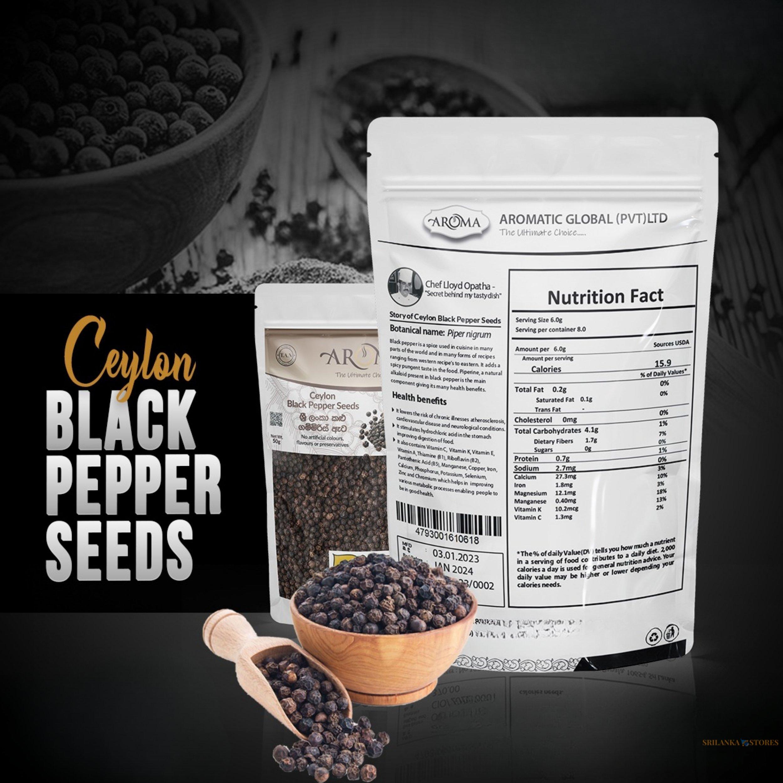 High-quality 100% pure Sri Lankan Black Pepper Seeds (50g), carefully cleaned and graded above 550g/l density for superior aroma and flavor. Produced under GMP, HACCP, FSMS (ISO 22000) standards and certified Made in Sri Lanka (NEDA).