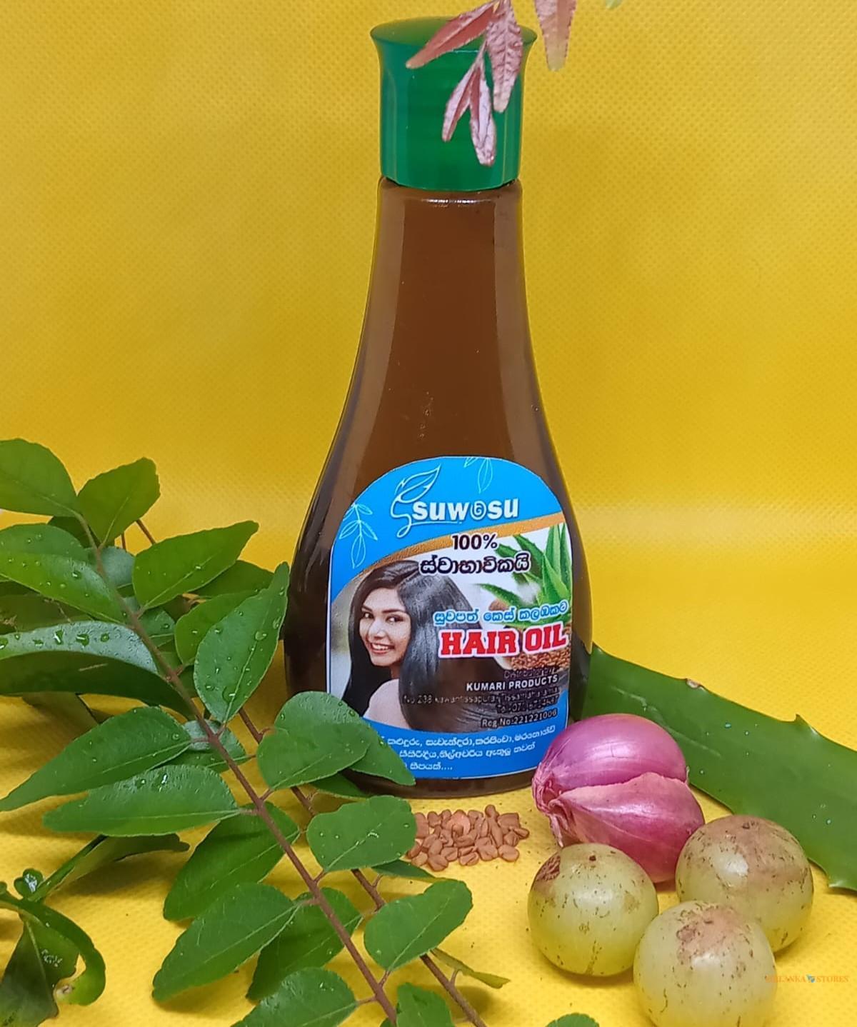 Suwosu Hair Oil is a carefully crafted herbal solution designed to improve the health and appearance of your hair. Made from a blend of traditional Sri Lankan medicinal herbs, this oil provides a natural remedy for common scalp and hair issues.